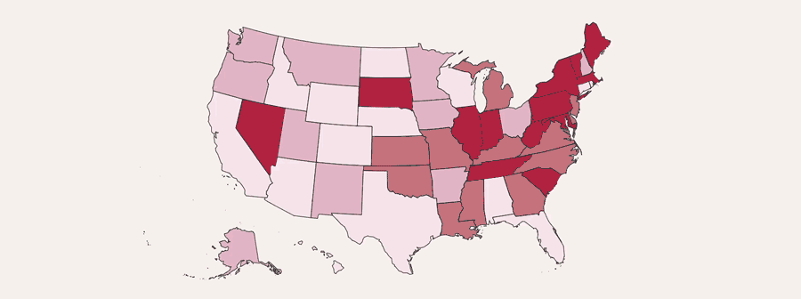 This is a choropleth map, so the focus is on categorizing states into X amounts of buckets. There are no right answers to the question on how many buckets of categories you should have; I chose 4 groups of quantiles, but technically you can divide the data into however many categories, within reason.