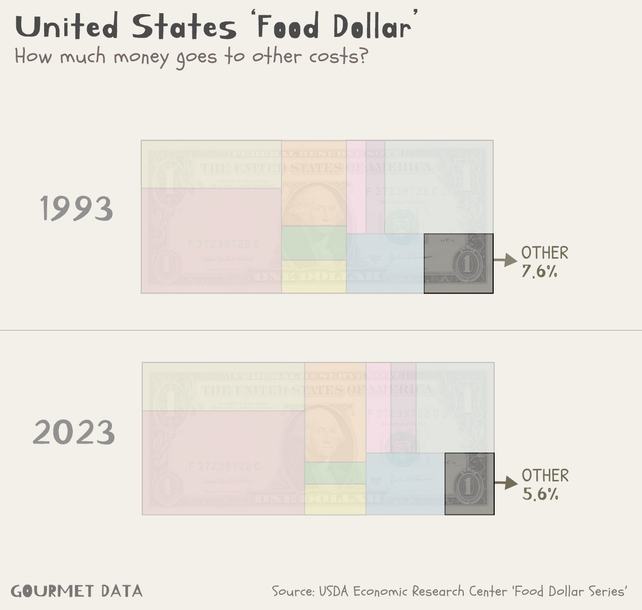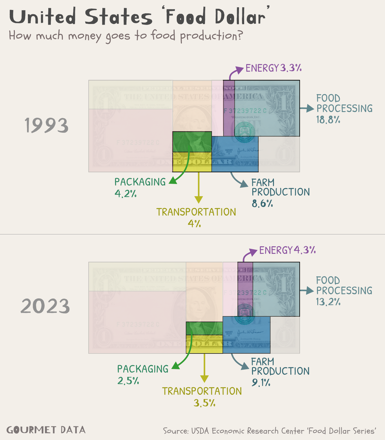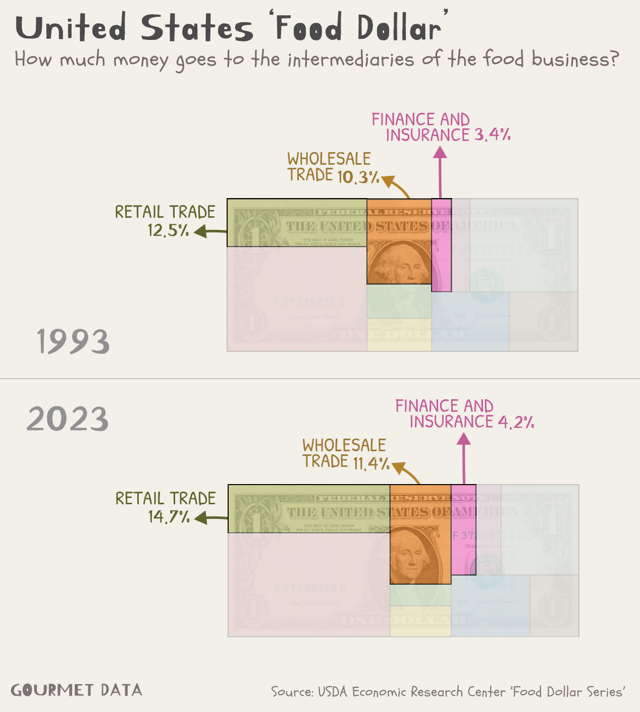 The food dollar is exactly the type of mnemonic device I love, so it kept my attention these last few weeks as the Thanksgiving holidays came around and gaslit Americans (me included) to spend even more money on food. Looking at the 12 or so subcategories of the 'food industry', I could see how they could be re-arranged into specific contexts, and there were three subcategories that came to mind in particular as being the most interesting: