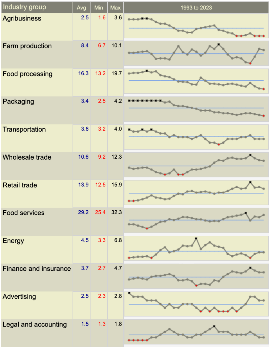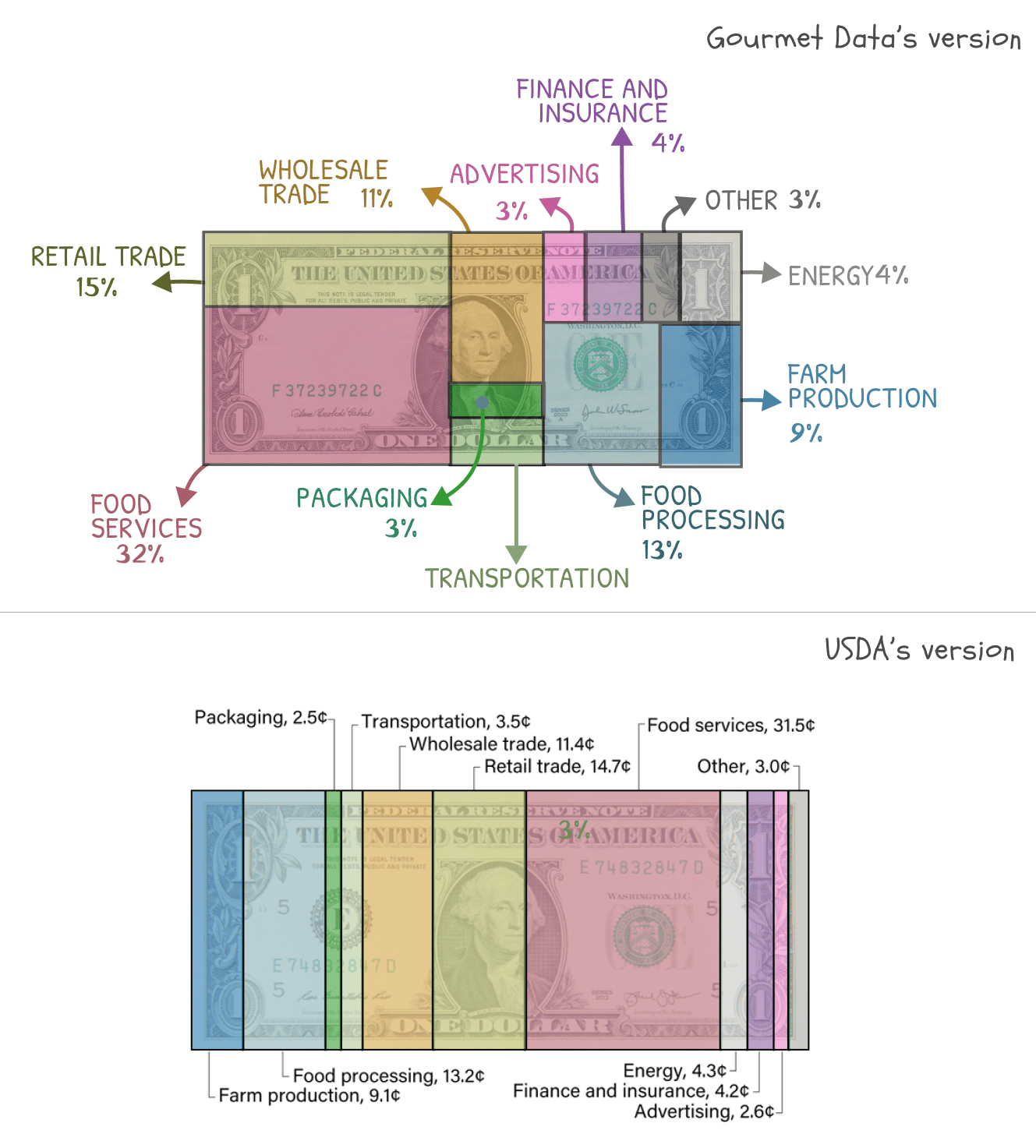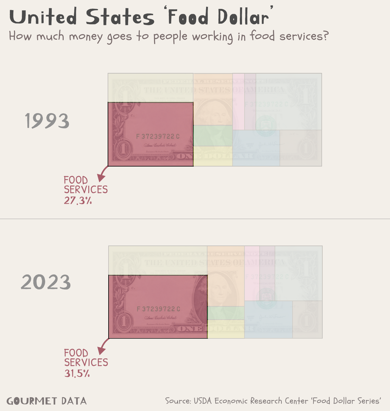 The food dollar is exactly the type of mnemonic device I love, so it kept my attention these last few weeks as the Thanksgiving holidays came around and gaslit Americans (me included) to spend even more money on food. Looking at the 12 or so subcategories of the 'food industry', I could see how they could be re-arranged into specific contexts, and there were three subcategories that came to mind in particular as being the most interesting: