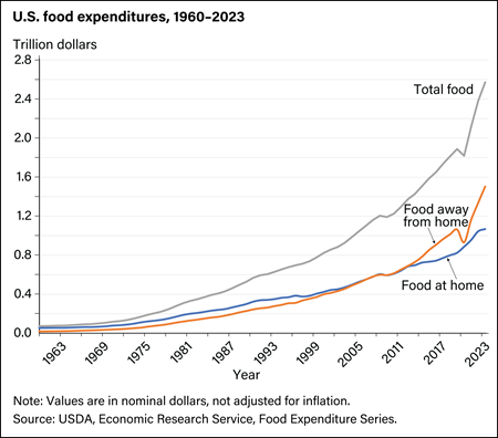The U.S. Food Dollar is a metric developed by the USDA to better understand the costs of food spending. Essentially, it takes the total amount Americans spend on food, and segments how each dollar is distributed among the various industries along the supply chain. For instance, food service establishments received a share of about 31.5 cents for every 'food dollar' spent in 2023.