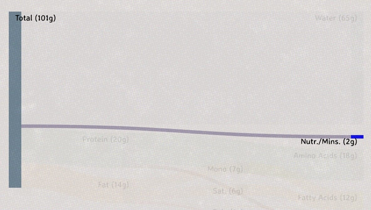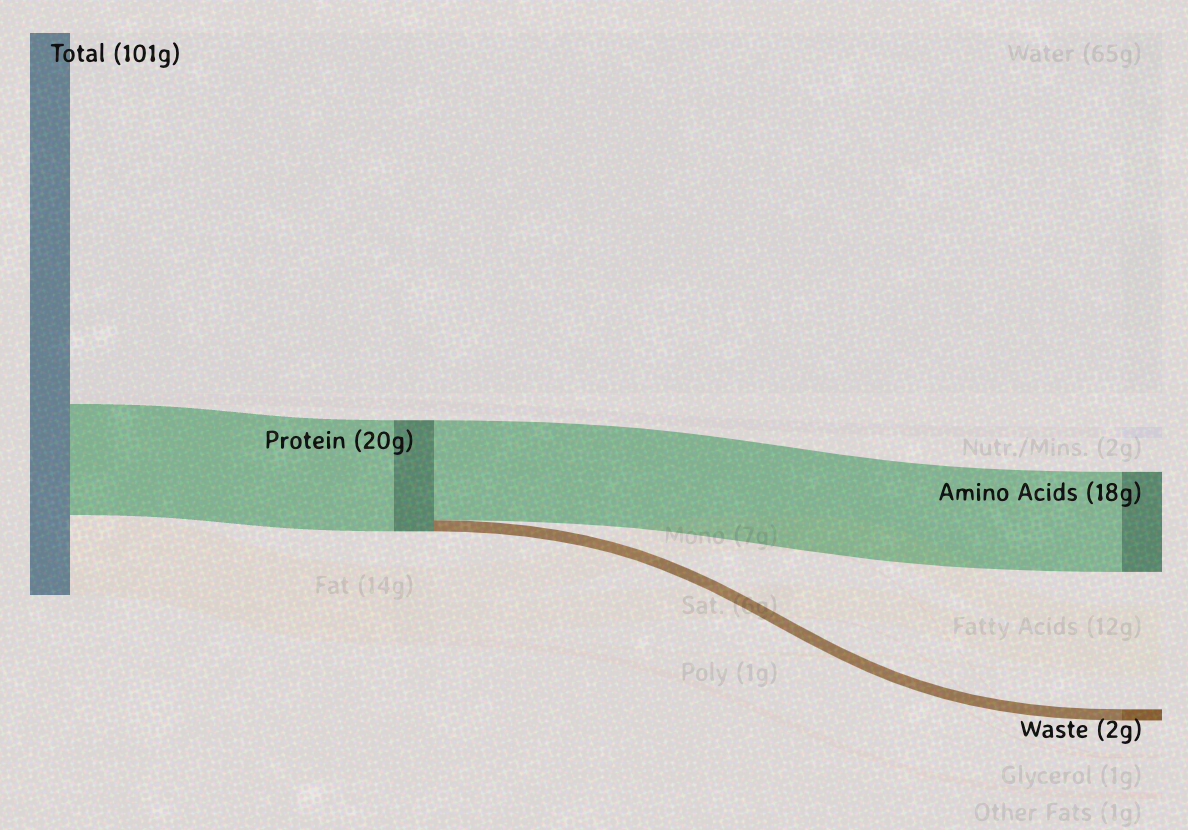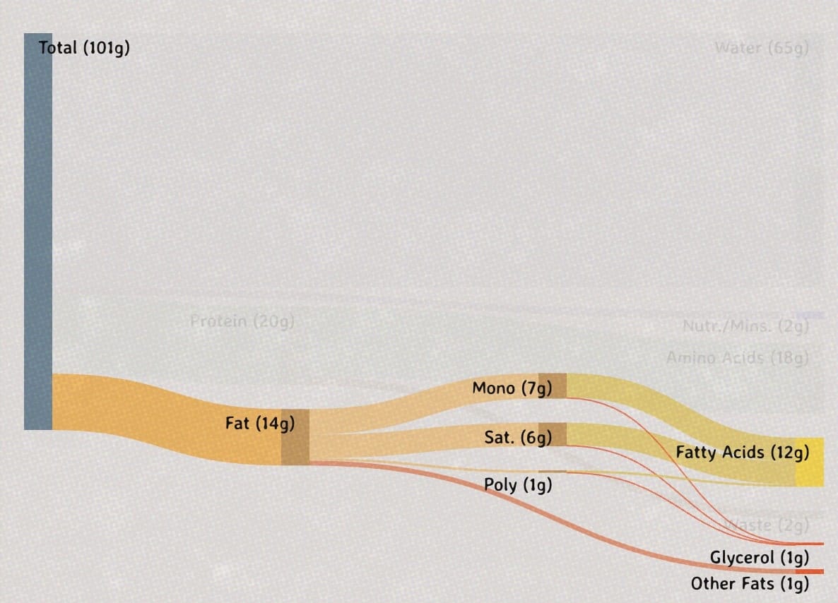 When examining a Sankey diagram that compares the nutrient composition of raw and cooked meat, it seems like the proportion of nutrients—such as protein and fat—in cooked meat is significantly higher than in its raw counterpart. This, technically, would imply that cooked meat is ‘more healthy’ than its raw counterpart.