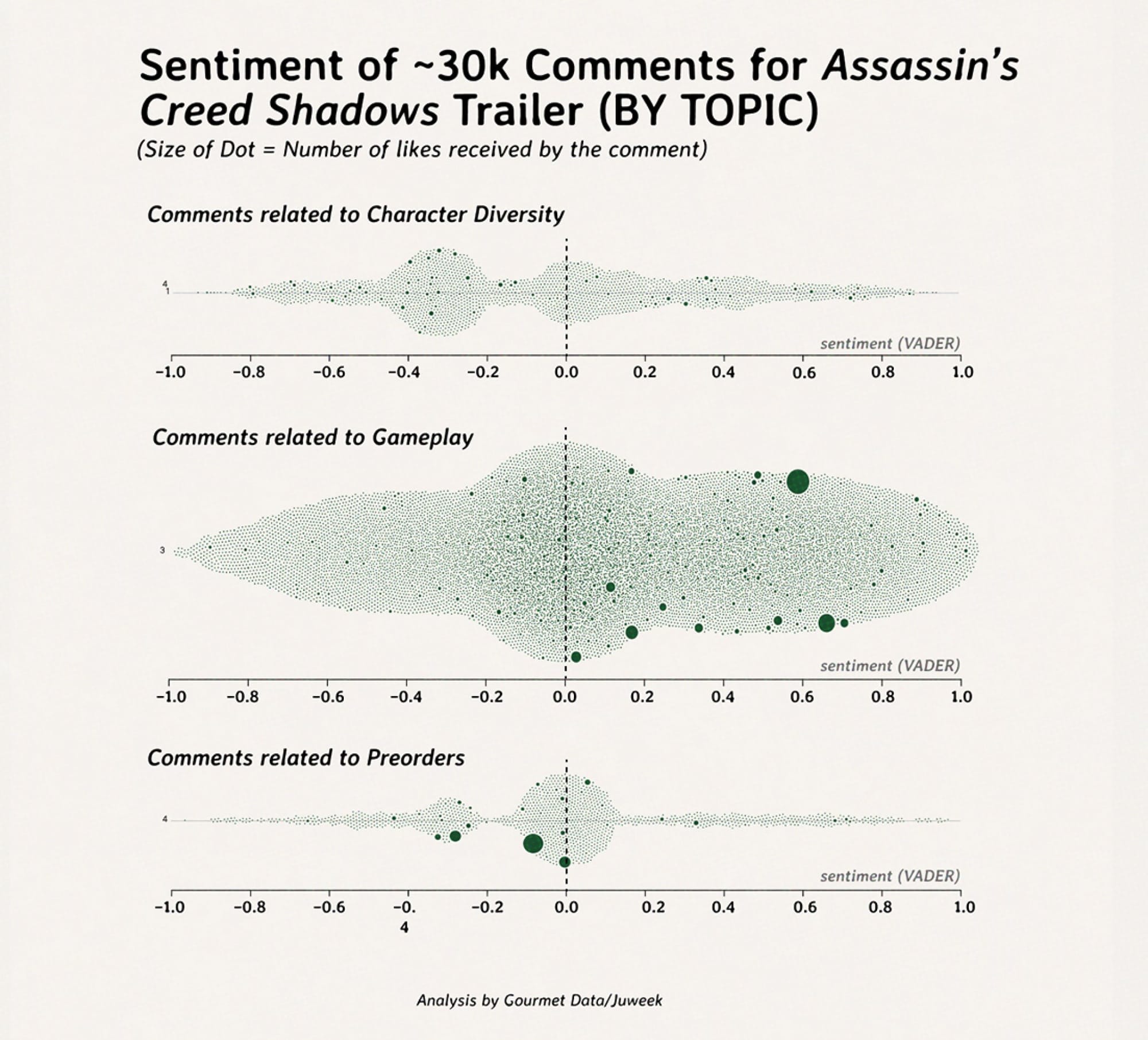 And, because of those comments, I can make a graph like this, where I separate the comments into topics, and assign each a sentiment score.