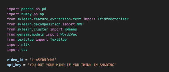 - we will choose a video and scrape the comments using Youtube's API