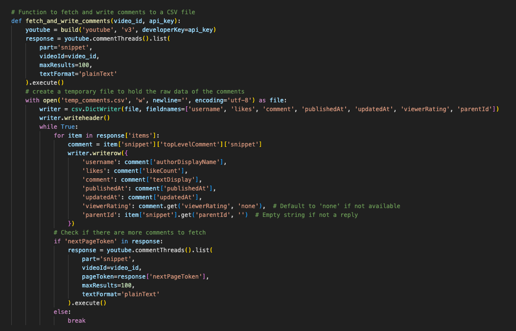 Here's the rest of the code; I pass in the video id and the api key, and essentially run youtube's api by executing the youtube.commentThreads().list() function, and writing the response to a csv.