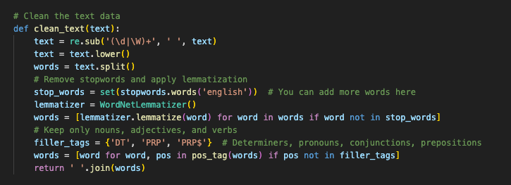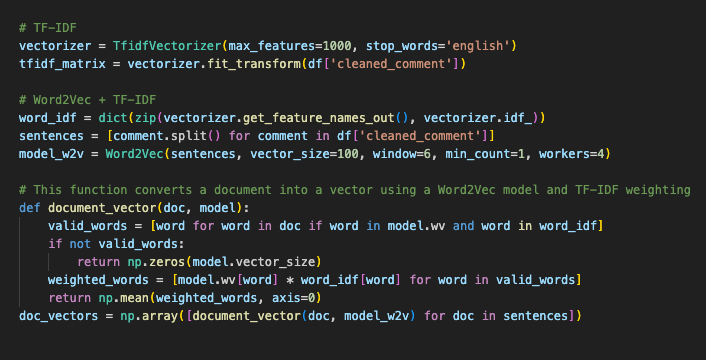 Word2Vec + KMeans with TF-IDF Weighting: If you’re dealing with more complex text where the context and relationships between words are crucial, I ended up using Word2Vec with KMeans and TF-IDF weighting. Word2Vec captures the meaning of words based on their context, and TF-IDF weights them by importance. This method is ideal for applications like sentiment analysis, which we plan on doing further down.
