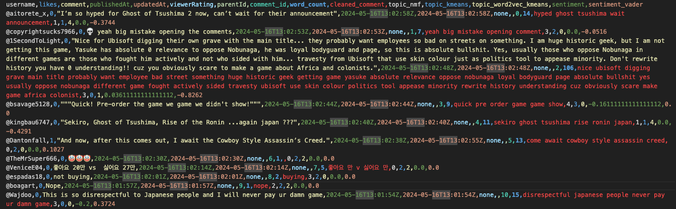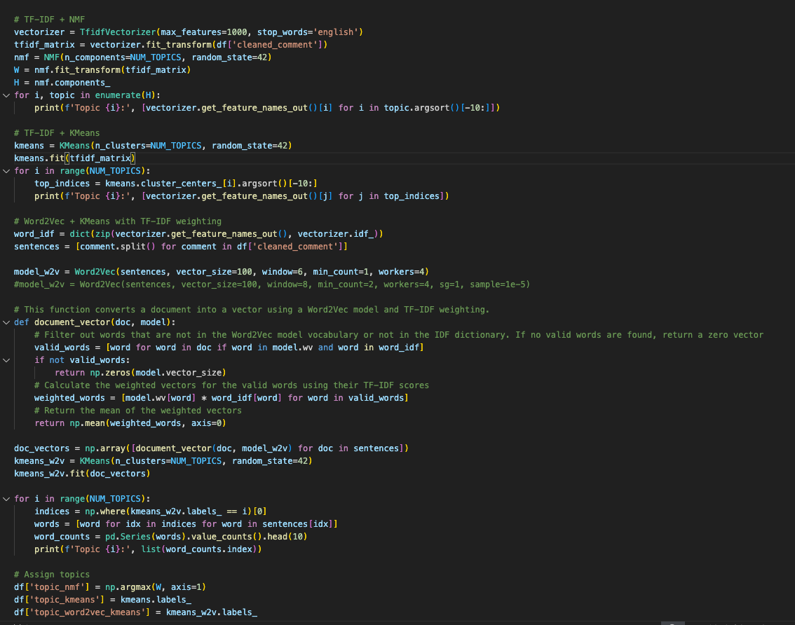 This dataframe will be exported as a CSV, which means, at the end of this script, we will have the screenshot I shared above: a comment, three assigned topic numbers (one for each method), and a sentiment score.