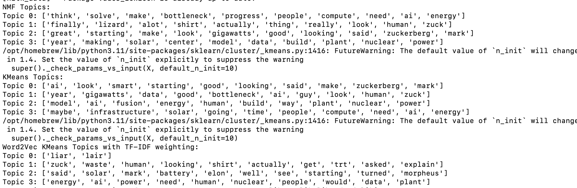 The next thing on our list is something called topic modeling; essentially, this is a situation in which we try to group the comments by topic, and just like there are a few ways to tokenize text, there are a few ways to topic model: NMF and KMeans. each algorithm comes out with a similar output; a grouping of X amount of words that seem to be related to each other. This, in essense, is your 'topic'. (This is an example for a Mark Zukcerberg interview with Dwarkesh.)