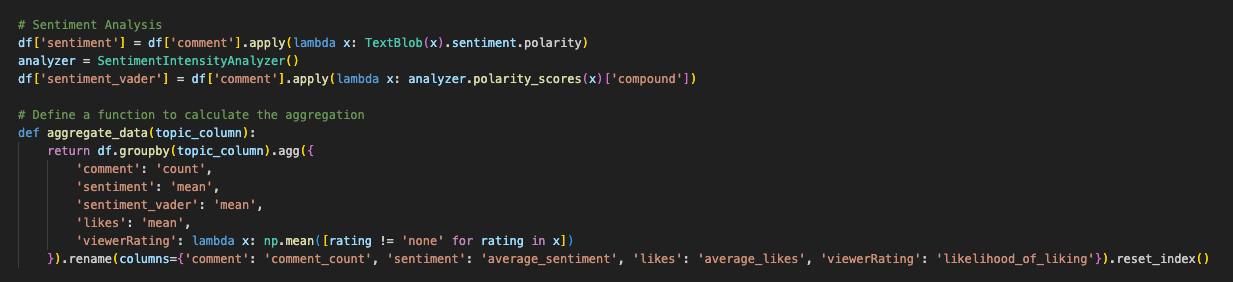 Those scores are attached to the same dataframe we've been keeping track of, the one where we recently assigned three different topic numbers. We simply need to apply the sentiment and sentiment_vader scores, alongside renaming some of the comments, to get our wanted output.